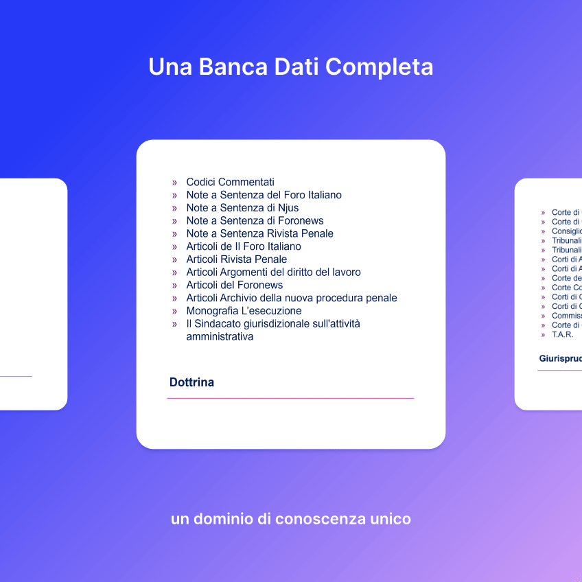 La Banca dati è completa, affidabile e aggiornata e si compone di diverse categorie di contenuti quali giurisprudenza, normativa e dottrina.